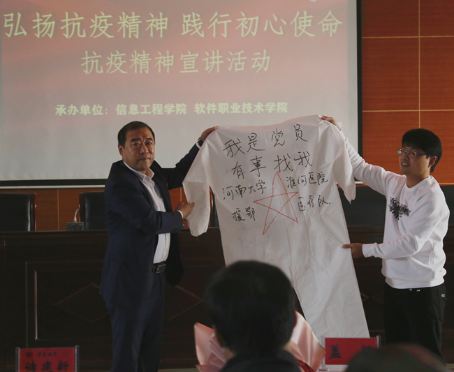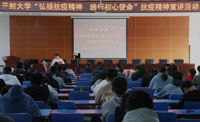 本站讯 10月29日下午,由学工部主办,信息工程学院(软件职业技术学院)承办的“弘扬抗疫精神 践行初心使命”抗疫精神报告会在土木学院六楼报告厅举行。河南大学淮河医院事业发展部副主任李国杰、盖颖,河南省呼吸与危重症学会呼吸治疗分会青年委员、开封市重症医学会委员、河南首批援鄂医疗队队员、河南大学淮河医院主治医师戚冠斌,校党委副书记储建新,组织统战部、学生工作部负责人和各院部师生代表参加了宣讲活动。