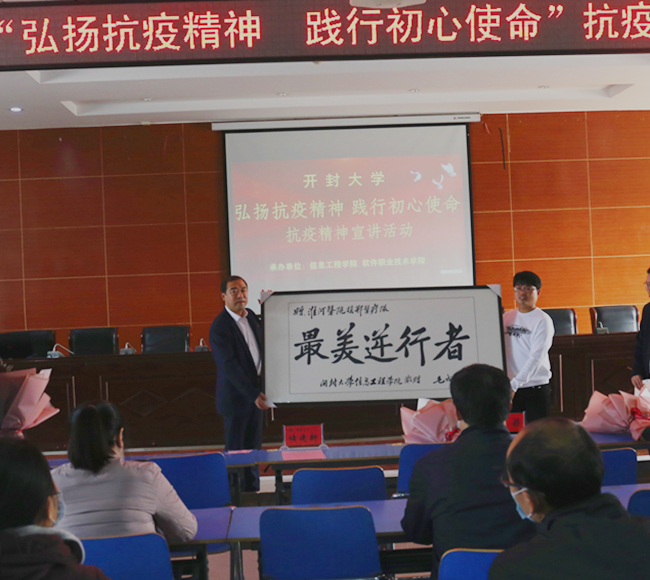 储书记代表学校向河南大学淮河医院援鄂医疗队赠送了书法家撰写的牌匾,淮河医院援鄂医疗队向开云kaiyun官网捐赠援鄂医疗队队员签名的医护服。