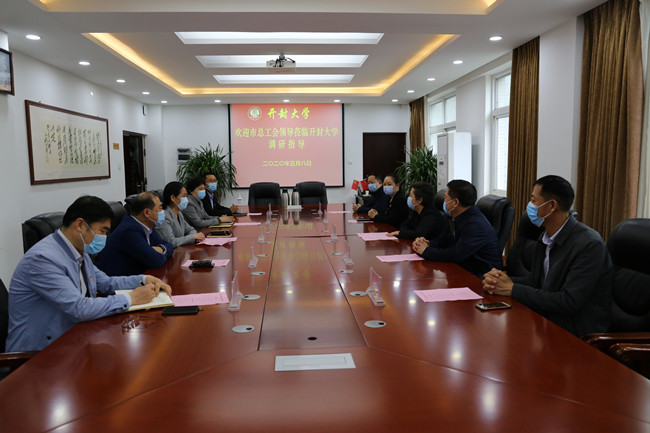 本站讯 5月8日上午,开封市人大常委会副主任、市总工会主席王文娟,市总工会党组书记、常务副主席和宝杰一行5人莅临开云调研。校党委书记陈灿、党委副书记储建新、工会主席成芳及相关职能部门负责人陪同调研。