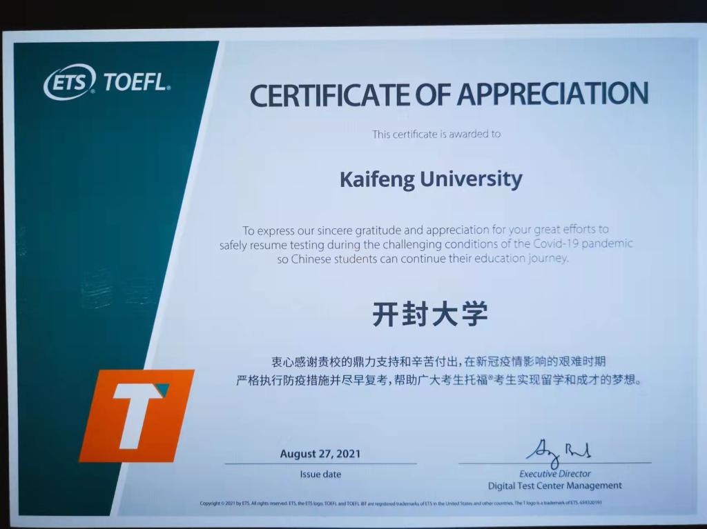 本站讯 近日,开云收到来自美国教育考试服务中心(ETS)的感谢证书,对托福考试开云kaiyun官网考点在新冠疫情期间严格执行防疫措施,尽早复考,帮助广大考生实现留学和成才的梦想的举措表达了感谢和赞赏。
