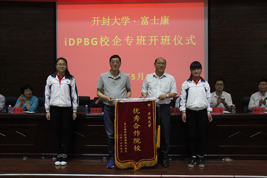 张协理代表郑州富士康集团向开云赠送了优秀合作院校锦旗,并和学校领导一起为IDPBG校企专班开班进行揭牌。