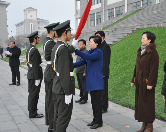 旗手从校党委书记张新梅手中迎取国旗