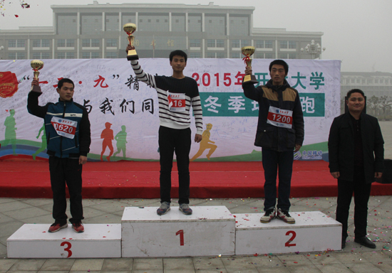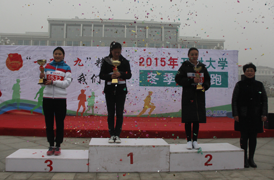 随着一声发令枪响,冬季越野赛正式拉开帷幕。赛场上,400余名男女参赛队员,在轮滑协会同学们的引领下,你追我赶,比体能、比毅力、比作风,奋力拼搏;赛场外,拉拉队的加油声、呐喊声此起彼伏,各院部的红旗招展,等待着运动员的凯旋,整个校园充满了朝气与活力。经过激烈角逐,最终,旅游学院吕晨旭同学、土木建筑工程学院樊守宇同学、财政经济学院王帅同学夺得此次活动男子组前三名。女子组前三名由财政经济学院刘楠楠同学、化学工程学院彭冉同学、旅游学院张纪芳同学获得。党委宣传部、团委负责人分别为获得女子组、男子组前三名的同学颁奖。