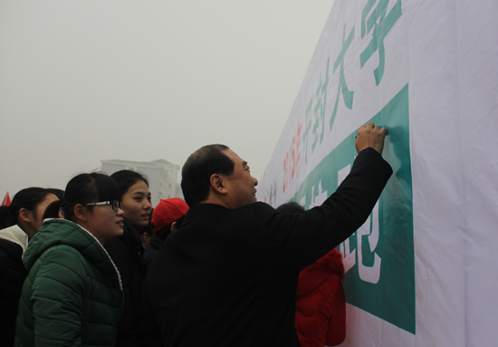 起跑仪式后,师生在“一二·九精神与我同行”主题喷绘上签字。