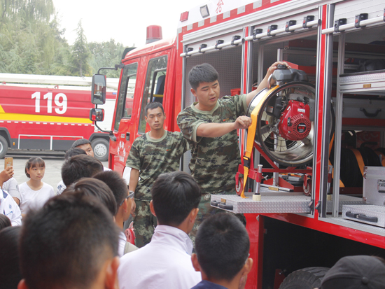 讲座结束后,新生代表前往开封市龙亭区消防特勤中队,同学们参观了消防车,消防器材,救援器材等。消防官兵为同学们详细地讲解了消防器材的作用,以及如何使用消防器材。有的同学还穿上消防服,背上氧气瓶,坐上消防车,体验了一次消防员生活。