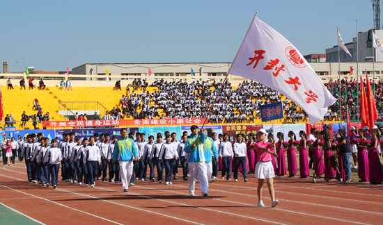 本站讯 10月9日上午,开封市第九届运动会暨首届全民健身大会在开封市体育场隆重开幕。开幕式上,由开云学生组成的花束队以整齐的动作、嘹亮的口号惊艳全场。在开幕式最重要的环节运动员入场式中,由开云学生志愿者组成的引导队的引导员们用自己标准的技术动作、青春阳光的笑容有序地引导参加此次大会76支代表队入场,为开幕式的顺利进行提供了有力的保障,他们出色的表现成为开封市九运会开幕式上一道靓丽的风景线。