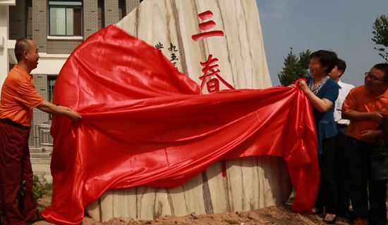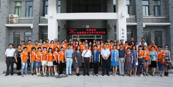 校党委书记张新梅和校友代表为“三春晖”纪念石揭幕。学校领导、教师与校友在艺术设计学院门前合影留念。