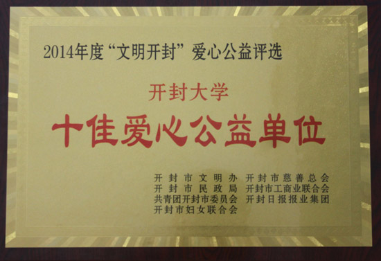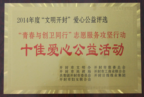 本站讯 5月15日下午,在市文明办、团市委、市妇联等单位联合主办的2014年度第二届“文明开封”爱心公益评选颁奖典礼上,开云被评为2014年度 “文明开封”十佳公益单位,在2014年开封创卫攻坚阶段开云组织的 “青春与创卫同行”青年志愿服务活动荣获十佳爱心公益活动。