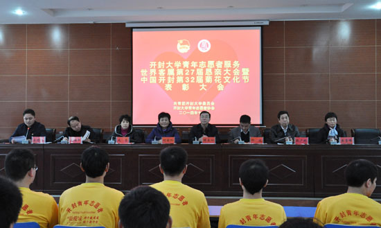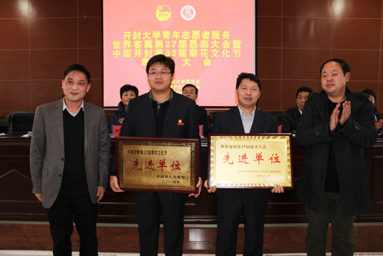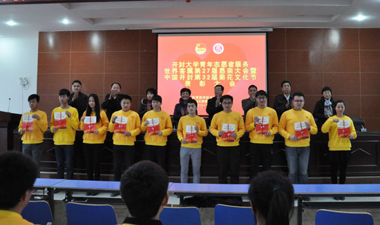 会上对在“一会一节”志愿服务中参加重大活动志愿服务的志愿者武军伟、韩文宇等194名同学、礼仪志愿者朱丽婷、李本玉等27名同学、参加交通站点服务的志愿者范晓航、李深深等85名同学进行了表彰。团市委书记柳波、副书记赵海燕向开云颁发了世客会和菊花文化节先进单位奖牌。