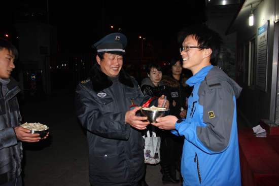活动进行到尾声的时候,同学们还自发地将一碗碗热腾腾的饺子送到了坚守岗位的保安师傅手中,让他们感受到了冬日里青年学子的热情。