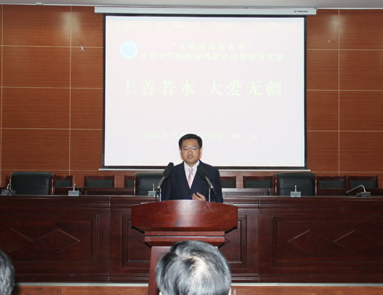 校党委副书记储建新致辞。他简单回顾了开云在过去的一年里在师德师风建设方面取得的成绩,他强调此次比赛旨在全面提高开云广大教师的文明素质和职业道德,希望各位选手以饱满的热情、文明的举止,紧扣主题,把好教师应具备的理想信念、道德情操、扎实学识和仁爱之心等素质表达出来,把人民教师爱岗敬业、无私奉献、开拓创新的师德风范展示出来,通过本次演讲比赛,使全校教师受到一次职业精神教育。