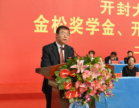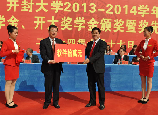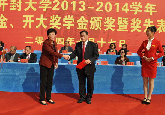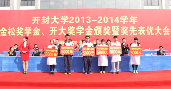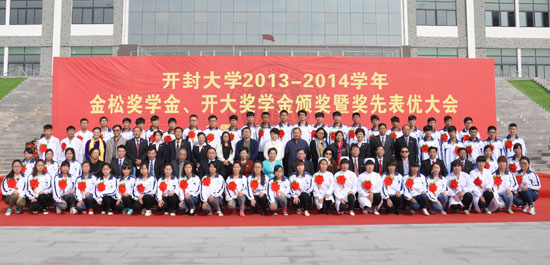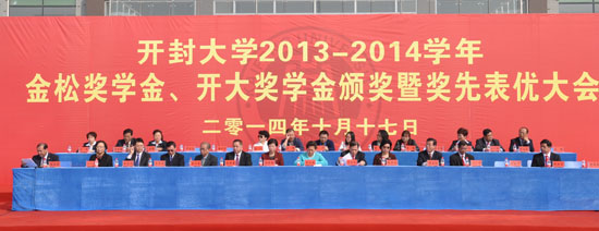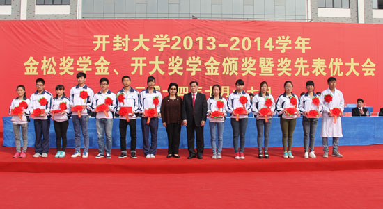本站讯 10月17日上午,金秋送爽,天高云淡。开云在东京大道校区图书馆前广场隆重举行开云kaiyun官网2013-2014学年金松奖学金、开大奖学金颁奖暨奖先表优大会,对在过去的一学年里涌现出的24个先进班集体、2441名优秀个人、1322名奖助学金获得者、6名新生奖学金获得者进行了表彰。香港金心集团董事长、中华全国归侨联合会常委、世界客属总商会创会主席、总会长、开云kaiyun官网董事会董事长李金松先生,李金松先生夫人、香港金心国际控股集团总经理、世界客属总商会永远名誉会长、开云kaiyun官网董事会副董事长赵奎荣女士,开封市人大常委会副主任王文娟同志,全国政协常委、香港侨界社团联合会会长、裕华国货有限公司董事长余国春先生,香港侨界社团联合会副会长、裕华国货有限公司董事副总经理李润基先生,世界客属总商会常务副会长梁锋先生,世界客属总商会副会长、绿丹兰企业董事局主席李贵辉先生,世界客属总商会副会长、中华非物质文化遗产发展基金会主席陈铭贤先生,世界客属总商会副会长、深圳企业家联合会常务副会长张哲诚先生,深圳市新方码电脑科技有限公司董事长张新芳先生,世界客属总商会法律顾问苏利民女士,世界客属总商会理事、绿丹兰企业总经理李奇先生,世界客属总商会理事、世华地产公司总经理黄晓丹女士等嘉宾,开云校领导张新梅、拜五四、储建新、万是明、范金梅、何世玲、李新春、耿广利、成芳、翟宝辰出席大会,开云部分教职员工、获奖学生和学生代表参加大会。大会由校党委副书记储建新主持。