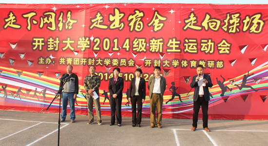 本站讯 10月24日下午,由校团委、体育教研部联合主办的“走下网络、走出宿舍、走向操场”2014级新生运动会隆重开幕。校党委书记张新梅、校党委副书记、体委主任储建新出席了本次活动,校党委组织部部长秦雪峰、纪委副书记赵海胜、体育教研部主任张广军及开云的1200名师生参加了本次活动。仪式由团委副书记田俊松主持。