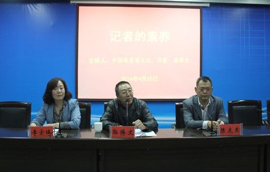 主任记者郭博文在晋安路校区行政楼二楼会议厅为60余名校学生记者做了题为“记者的素养”的讲座,郭老师以他资深记者的工作经验,从写作素质和采访素质两个方面告诉同学们,作为一名记者,不仅要有敏锐的新闻眼光,客观公正的态度,还要学习法律知识、行业规范、宗教习俗,掌握与人沟通的技巧等方面的内容。