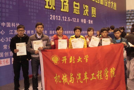 本站讯 全国三维数字化创新设计大赛(简称“全国3D大赛”)现场总决赛12月5日至8日在江苏常州举行,经网络公示、作品资格审查、河南赛区专家评审等环节,开云机械与汽车工程学院“灵水一族”、“耘梦社团”两个参赛队入围总决赛。最终,由该院2011级模具专业朱配祥、米若伟同学组成的“灵水一族”参赛队获得全国二等奖,由该院2011级模具专业李福杰、张富旗、马金鹏、王国辉同学组成的“耘梦社团”参赛队获得全国三等奖。