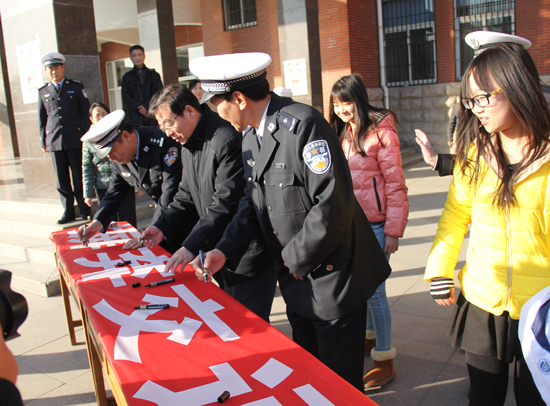 随后,开封市公安交警支队交警与开云师生共同在“摒弃交通陋习 安全文明出行”横幅上签字,并观看了交通安全宣传展板。