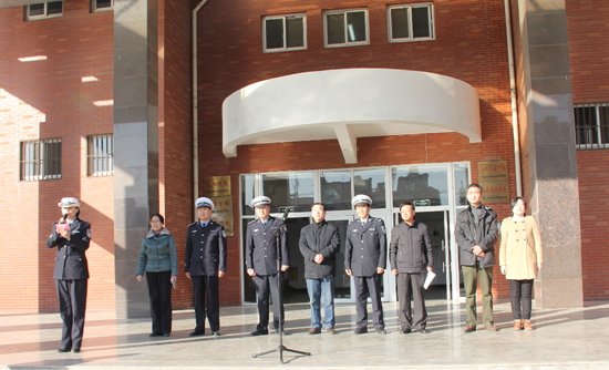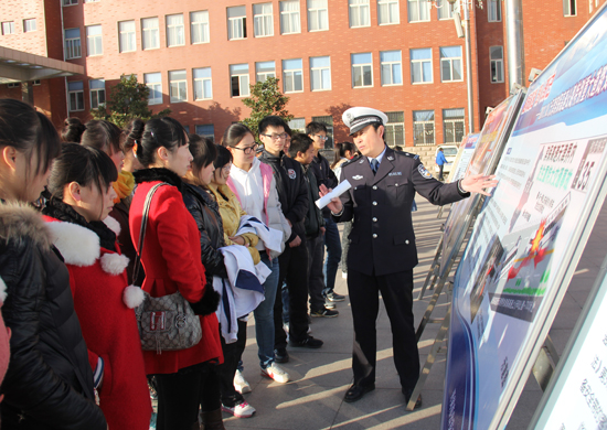民警张金良进行交通安全演讲,公安交警支队交警与现场师生共同演唱了歌曲《在安全的道路上》。