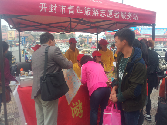 开云旅游学院的导游志愿者在火车站设立服务台,迎接来自五湖四海的游客,热情地为游客们搬运行李,指引路线,为游客们提供各种咨询服务。志愿者们还为游客们讲解开封市的发展现状、历史沿革、文化底蕴和景点布局,着重介绍了开封历史文化、旅游资源、建筑特色和饮食文化方面的概况,对游客们提出的各种问题耐心而仔细地回答。