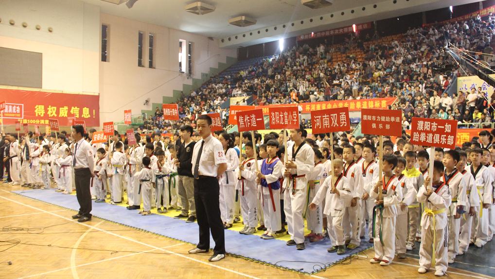 本站讯 4月30日上午,2013年河南省中小学生跆拳道锦标赛开幕式在郑州市体育馆隆重举行。本届锦标赛由河南省学生体育总会跆拳道协会主办、河南省跆拳道运动协会承办。来自全省中、小学校及跆拳道俱乐部53个代表队的近1200名参赛运动员报名参加了本次比赛。