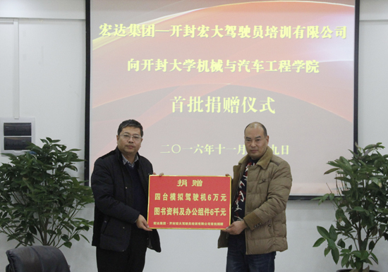 仪式上,宏达集团开封宏大驾驶员培训公司向开云机械与汽车工程学院捐赠了价值6万元的四台模拟驾驶机和6千元的图书资料及办公组件。