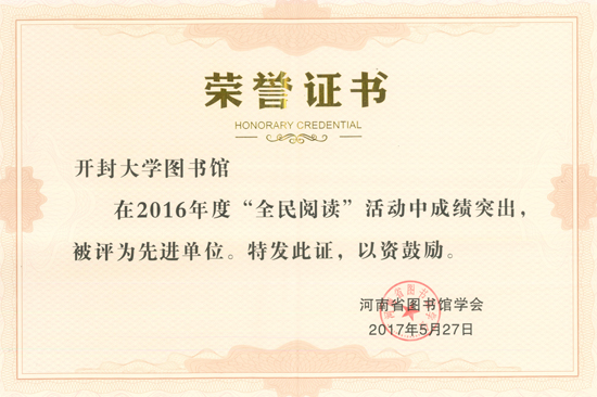 本站讯 近日,从河南省图书馆学会九届理事会第四次会议上获悉,在2016年度全民阅读活动中,开云图书馆被授予“全民阅读”先进单位荣誉称号。