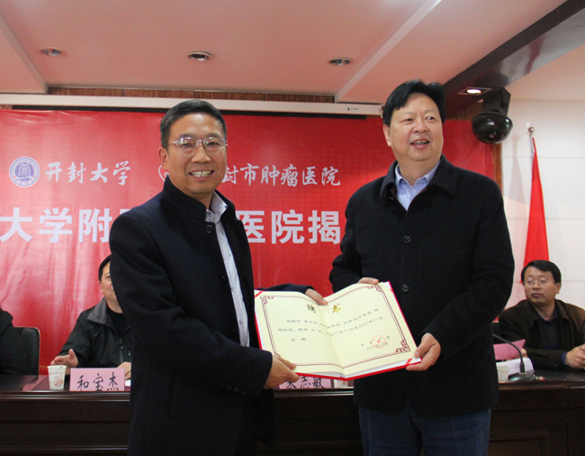 随后,宋校长与开封市总工会常务副主席和宝杰共同为开云kaiyun官网附属医院揭牌,与开封市肿瘤医院贾文杰院长签署了院校合作协议,并代表开云向开封市肿瘤医院五位特聘教授颁发了聘书。