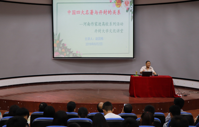 此次以“文学阅青春,书香满校园”为主题的讲座由中国红楼梦学会会员、开封市作家协会副主席、中国朗诵联盟副主席、《汴梁晚报》文娱副刊部主任、,主任编辑赵国栋老师主讲。赵老师曾在《人民日报》、《中古青年报》、《文艺报》、《北京文学》、《青年文学》和《河南大学学报》等报刊上发表小说、评论、论文多篇。论文《红楼梦作者新考》、《曹雪芹的真实身份》曾被《新华文摘》全文转载并引起广泛争鸣。讲座中,赵老师对我国古典名著《西游记》、《红楼梦》等做了深刻地讲解,并结合开封地理与历史故事,讲述了我国古代的历史成就及文化深度,让师生们领略了中国古典文学的博大精深。