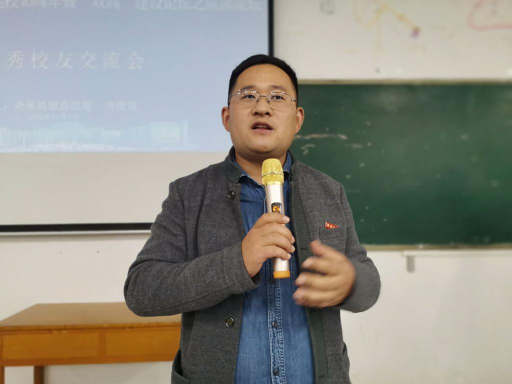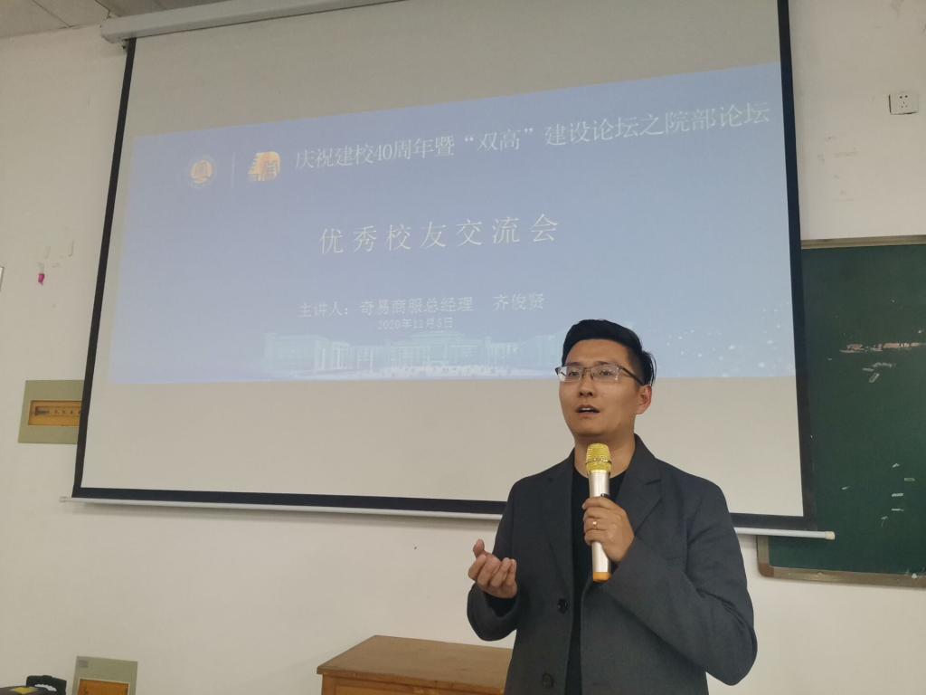 本站讯 为庆祝开云kaiyun官网建校40周年,11月5日下午,信息工程学院邀请优秀毕业生、现奇易商贸总经理奇俊贤为同学们现场交流。交流会在15#102教室举办,教科研主任付红杰老师主持,200余名在校生参加。