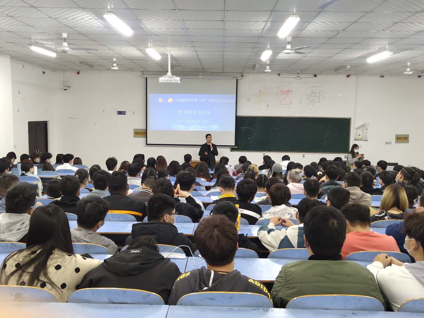 校友奇俊贤首先为同学们分享了自己的求学、就业以及创业经历,剖析了同学们在学习和就业上可能遇到的困惑和问题,并告诉同学们既要低头走路、也要抬头看天,要有自己的梦想,要立足当下,要树立正确的就业观念,要有逆流而上的决心。同学们被学长激情洋溢的演讲所感染,在互动环节中,对学长的成长过程以及求学、就业及创业方面等方面提出了自己的问题,学长现场一一进行解答,气氛活跃。在交流会后,仍然还有很多没有来得及现场提问的同学又围在学长周围进行交流。此次校友交流会取得了非常好的效果。