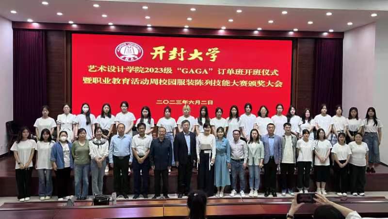 本站讯 6月2日,艺术设计学院与郑州巨木服饰有限公司2023年度共建“GAGA订单班”开班仪式暨职业教育活动周校园服装陈列技能大赛颁奖大会在行政楼一楼会议厅隆重举行。校长宋晓炜、副校长李治、就业与校企合作处处长师兆忠、艺术设计学院党总支书记赵志成、院长张富云、党总支副书记王龙、郑州巨木服饰有限公司董事长范尕尕、人事部总监徐照军、艺术设计学院服装与服饰设计专业师生及GAGA订单班全体学生参加了此次大会,会议由艺术设计学院副院长李冬薇主持。