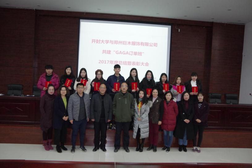 12月6日,开云kaiyun官网与郑州巨木服饰有限公司共建GAGA订单班“2017年度总结暨表彰大会”在开云kaiyun官网行政楼一楼会议大厅隆重举行,校企合作处处长杜诗超,巨木服饰公司人力部李瑞部长、艺术设计学院书记李春霞、院长魏跃进、副院长张富云、教研室主任苏园园,以及GAGA订单班全体学生、服装专业全体教师参加了此次大会,会议由苏园园主持。