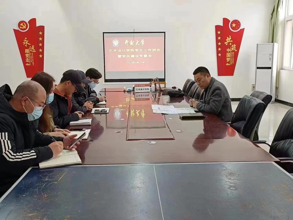 本站讯 为强化育人意识,落实立德树人根本任务,深入贯彻落实校党委学工部“学风建设年”的工作部署,培育优良校风和学风。3月20日上午,艺术设计学院在9号楼209会议室召开辅导员学生工作例会暨学风建设专题会。会议由艺术设计学院党总支副书记王龙主持,全体辅导员参加会议。