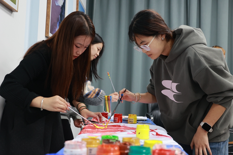 在创作过程中,学生们相互协作、交流,现场氛围热烈而融洽。该校艺术设计学院的指导老师也参与其中,给予学生们专业的指导和评价。此次活动不仅增强了学生团队合作能力和沟通能力,也让学生们更好地了解自己,提供了放松和减压的途径,促进健康成长。