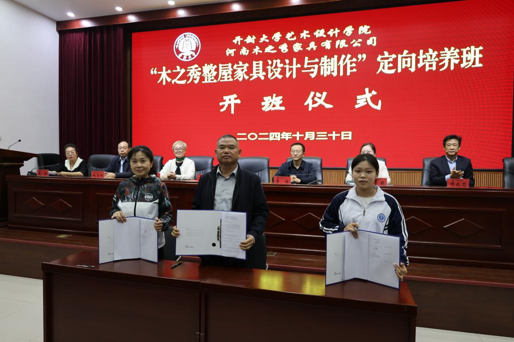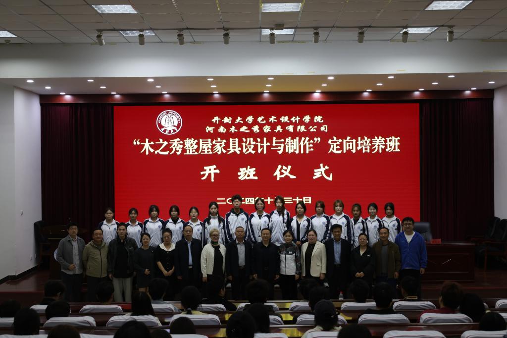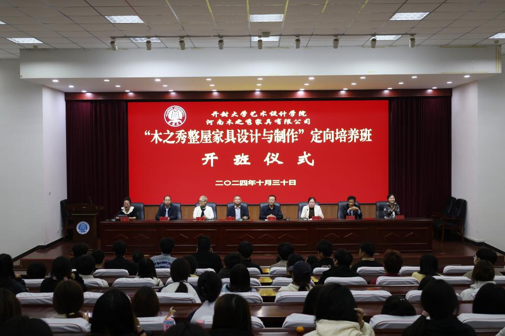 10月30日,开云kaiyun官网艺术设计学院与木之秀整屋家具设计与制作公司订单班开班仪式在行政楼第一会议厅举行。副校长李治、教务处处长王茜、产教融合服务中心主任师兆忠、河南木之秀家具有限公司董事长李鹏、总经理江霞、设计总监李萍、艺术设计学院党总支书记赵志成、院长张富云,环境艺术设计专业教师和全体环艺学生参加开班仪式,仪式由艺术设计学院副院长袁颖主持。